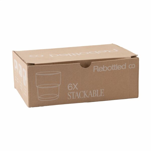 Rebottled® design stapelbaar drinkglas gemaakt van geupcyclede wijnflessen. Dit glas ligt lekker in de hand en heeft een gladde afwerking. Van hoge kwaliteit en geschikt voor water of frisdrank of cocktails. Vaatwasserbestendig tot 60C°. Voor behoud van de opdruk wordt met de hand afwassen aanbevolen. De glazen worden per 6 geleverd in een originele geschenkverpakking van gerecycled, FSC-gecertificeerd karton. Dutch design. Made in Holland. Inhoud ca. 300 ml. Rebottled® upcyclet lege wijnflessen tot 100% circulaire design items.