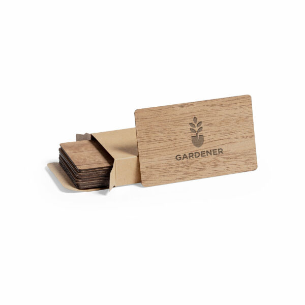 Set van 10 natuurlijnkaarten, gemaakt van natuurlijk hout met geaderde afwerking en speciaal ontworpen voor laserprinten. Gepresenteerd in een individuele doos van kraftkarton.