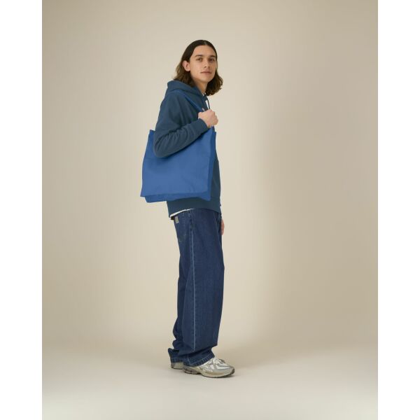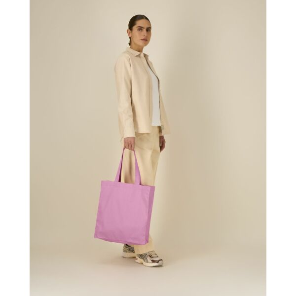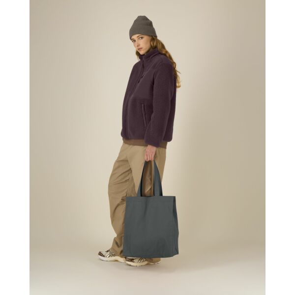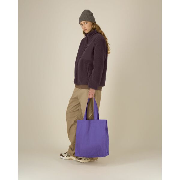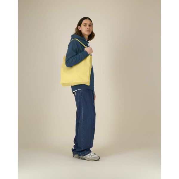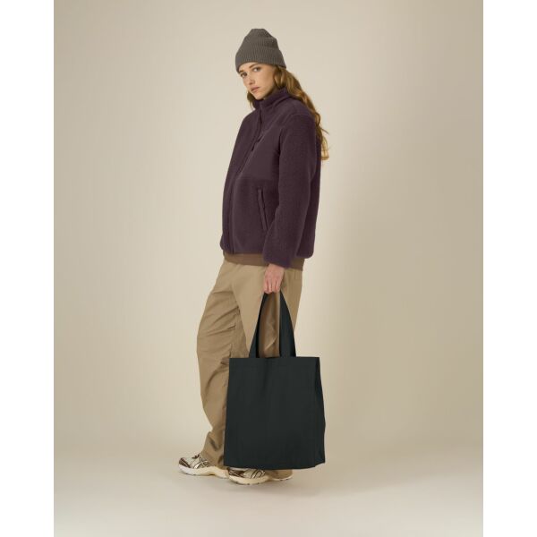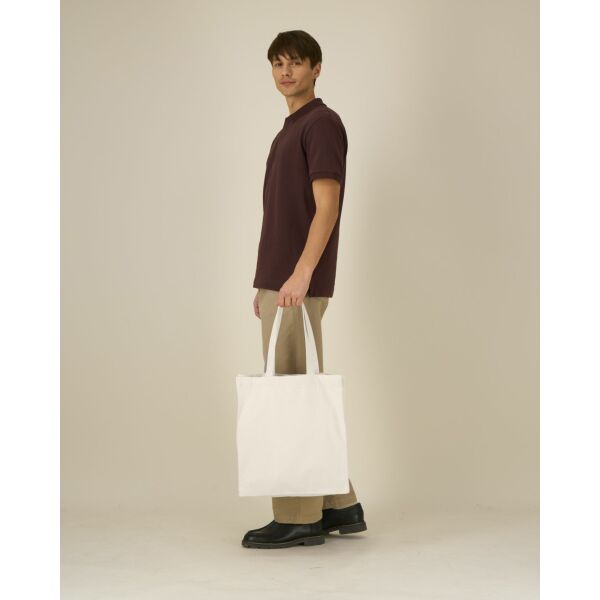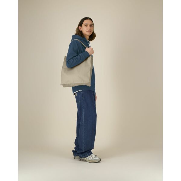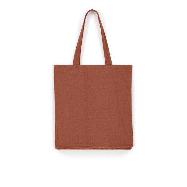 Gevouwen zoom aan de bovenkant. Plooi aan de onder- en zijkant. Lange stoffen handgrepen met kruisstiksels voor versteviging . Stoffen binnenvak. Enkele stiksels aan de bovenrand