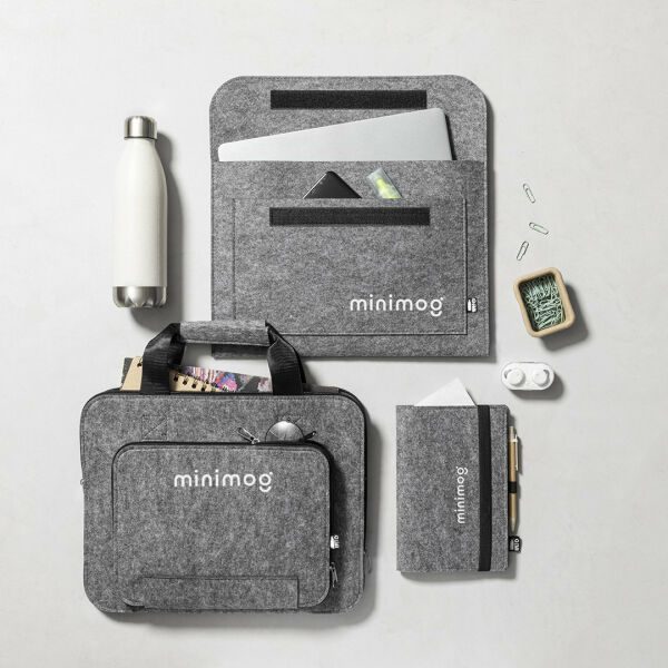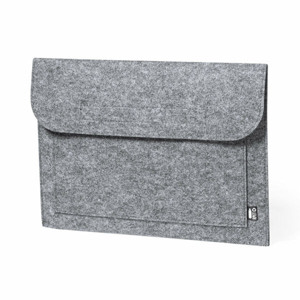 Natuurlijn laptophoes van resistent, gerecycled RPET-vilt. Het resultaat van de combinatie van de recyclageprocessen van plastic materialen samen met de duizendjarige techniek van viltproductie, wat resulteert in een eco-trendmateriaal dat niet alleen van gerecycleerde oorsprong is, maar ook recycleerbaar wordt. Klep met klittenbandsluiting en voorvak, met RPET-embleem op het buitenlabel.